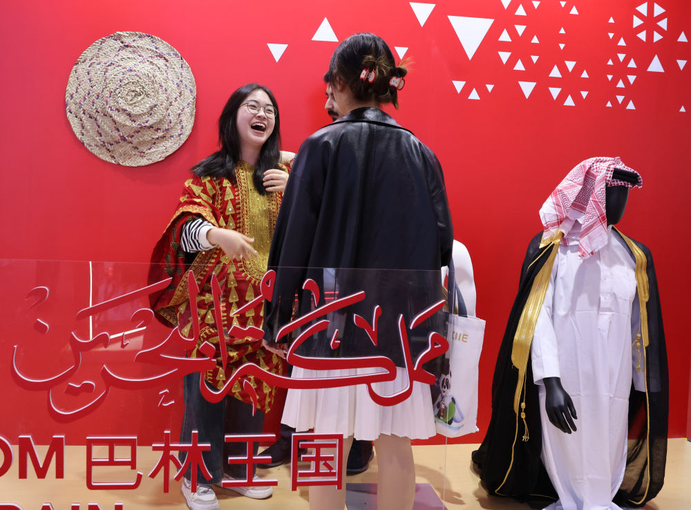 11月5日,參會者在第七屆進(jìn)博會國家展巴林館試穿巴林服裝。新華社記者 殷剛 攝