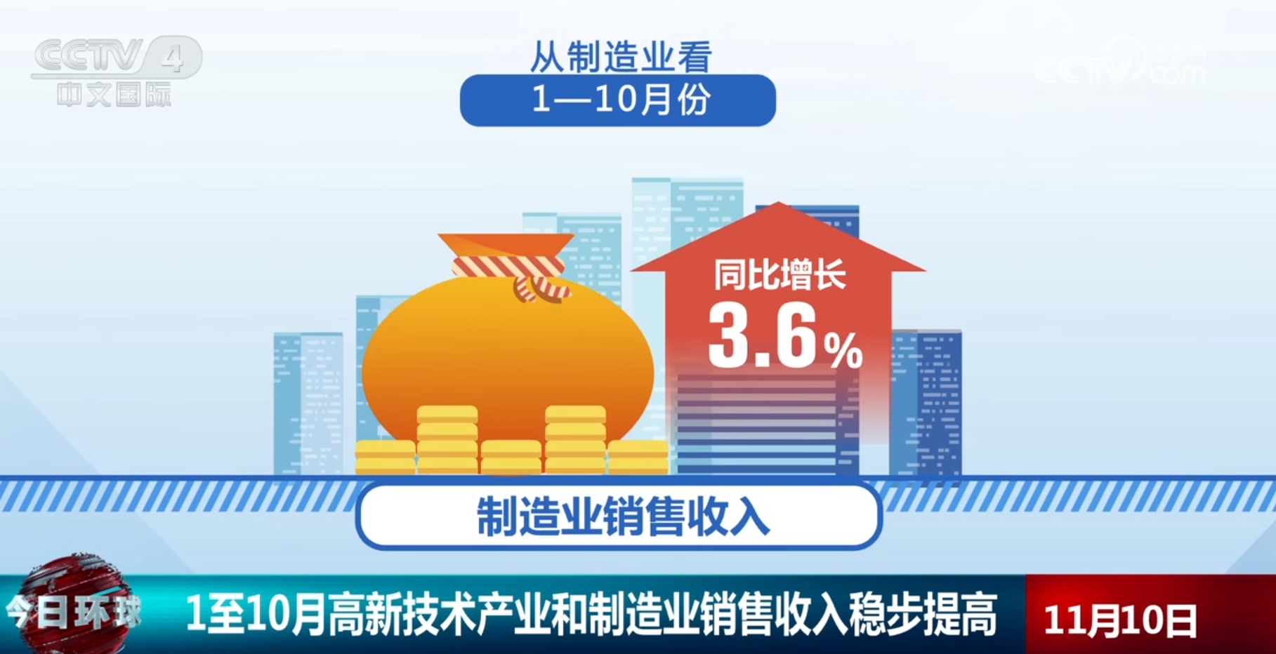 從制造業(yè)看,1—10月份,制造業(yè)銷售收入同比增長3.6%。其中,裝備制造業(yè)、數(shù)字產(chǎn)品制造業(yè)、高技術(shù)制造業(yè)銷售收入同比分別增長5.3%、8.5%和8.7%,特別是計(jì)算機(jī)制造、通訊及雷達(dá)設(shè)備制造、智能設(shè)備制造等先進(jìn)制造業(yè)銷售收入同比分別增長16.4%、21.6%和11.2%,反映制造業(yè)高端化、智能化穩(wěn)步推進(jìn)。