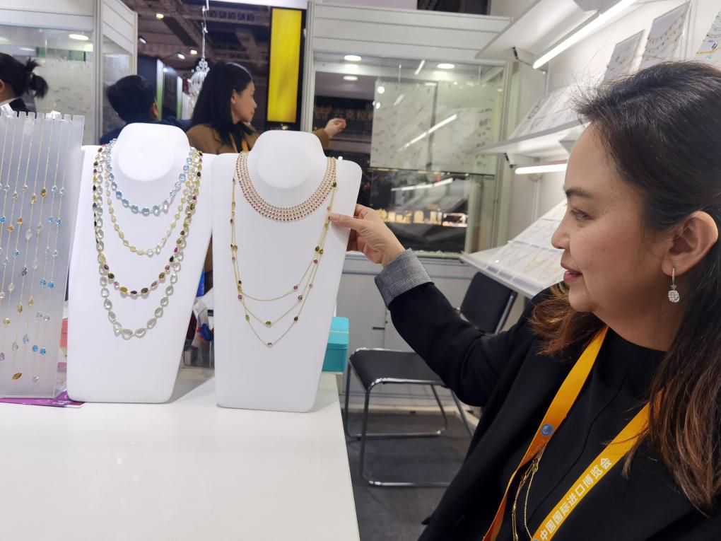 11月7日,首次參展進(jìn)博會的阿拉尼婭在介紹展位上的珠寶首飾。 新華社記者 許曉青 攝