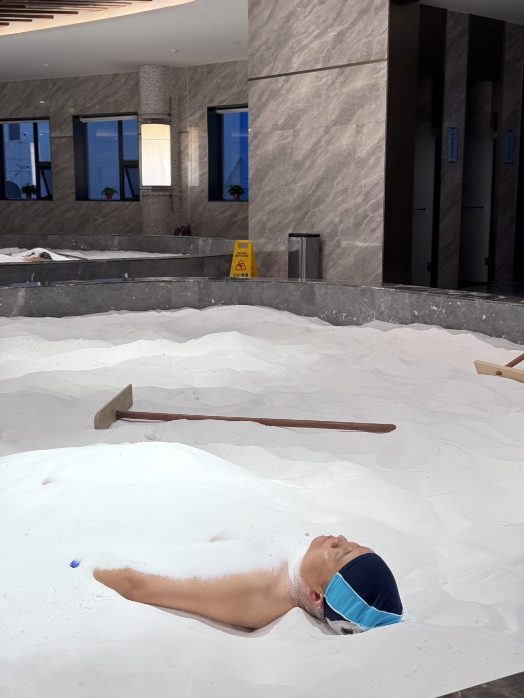 一位游客正在進(jìn)行礦鹽理療,通過礦鹽覆蓋全身以達(dá)到促進(jìn)血液循環(huán)、疏通經(jīng)絡(luò)的作用。 澎湃新聞?dòng)浾?金向玉 攝