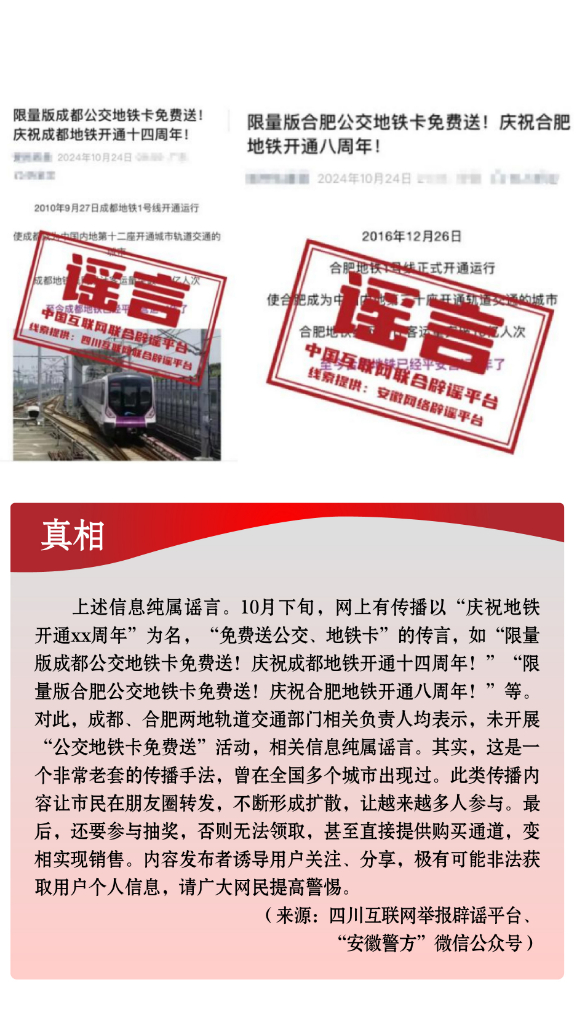 假冒官方虛構(gòu)政策。一些不法分子冒充權(quán)威機(jī)構(gòu),散布涉公共政策類謠言,誤導(dǎo)公眾認(rèn)知。有的假借官方名義,偽造政策文件,實(shí)則行騙牟利,侵犯群眾利益。如有人利用公眾對“大數(shù)據(jù)”“數(shù)字經(jīng)濟(jì)”等內(nèi)容的認(rèn)知盲區(qū),假借“國家數(shù)據(jù)局”“中國人民銀行數(shù)字貨幣研究所”等官方名義,偽造政策文件,謠稱“國家數(shù)據(jù)局頒發(fā)‘個(gè)人數(shù)據(jù)資產(chǎn)擁有權(quán)確權(quán)憑證’”“數(shù)字人民幣平臺(tái)將發(fā)放‘?dāng)?shù)字資產(chǎn)紅利’”,相關(guān)部門均已發(fā)布辟謠聲明。有的從公開發(fā)布的政策信息中摘取碎片化信息,斷章取義,對政策歪曲解讀。如個(gè)別自媒體故意混淆“個(gè)人養(yǎng)老金”與“基本養(yǎng)老金”的概念,傳播“領(lǐng)取養(yǎng)老金要繳3%個(gè)稅”“養(yǎng)老金個(gè)稅起征點(diǎn)為5000元”等不實(shí)信息,引發(fā)公眾誤解。另有“成都、合肥等地免費(fèi)送公交地鐵卡”謠言,以“免費(fèi)”“贈(zèng)送”為噱頭,誘導(dǎo)用戶關(guān)注、分享,最終可能導(dǎo)致用戶遭受個(gè)人信息泄露或其他不法侵害。