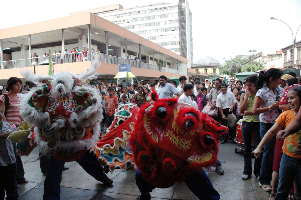 2006年1月28日農(nóng)歷除夕當(dāng)天,華僑舞獅團(tuán)在秘魯利馬唐人街上舞獅拜年。