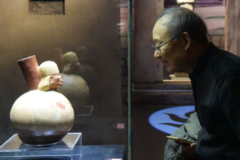 2020年1月17日,“安第斯文明特展——探尋神秘而又令人向往的印加帝國(guó)”在天津博物館開展。這是參觀者觀看來自秘魯?shù)恼蛊贰?/p>