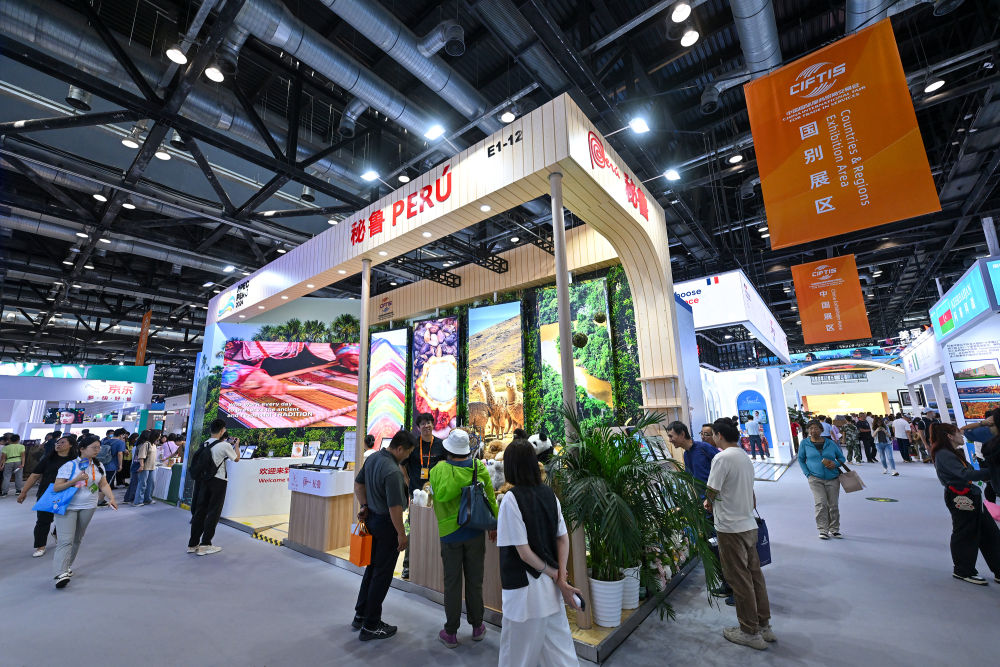這是2024年9月15日在北京服貿(mào)會(huì)國(guó)家會(huì)議中心展區(qū)拍攝的秘魯展臺(tái)。