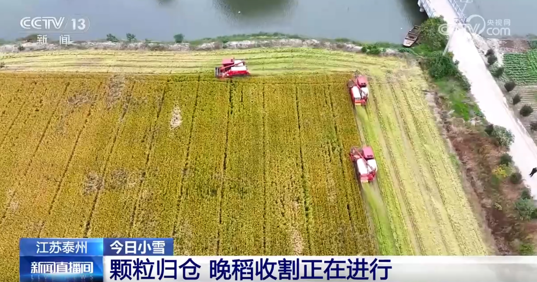 我們現(xiàn)在看到的是江蘇泰州正在進(jìn)行的晚稻收割作業(yè)。這個時候,當(dāng)?shù)卦绲竞椭械疽呀?jīng)收獲完成,收割機正開足馬力進(jìn)行晚稻收獲,割穗、脫粒、粉碎秸稈,一氣呵成,連倒伏的稻穗也被采收干凈,金黃飽滿的稻谷順著管道傾瀉而下,顆粒歸倉。