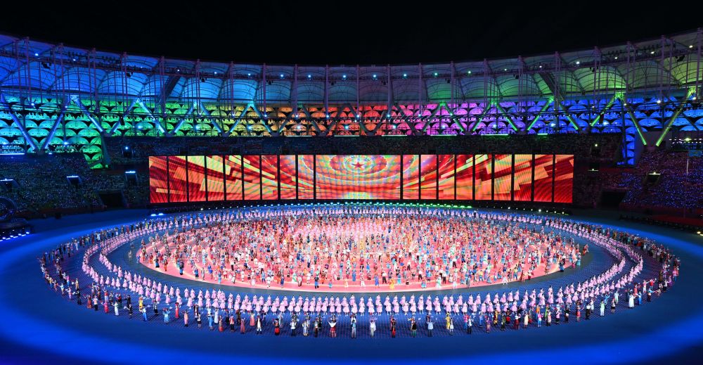舞臺中間是一個圓形地屏,地屏外圈,導(dǎo)演組專門增加“星空矩形”地毯,圍繞中心地屏影像始終保持圓形圖案,構(gòu)成“同心圓”;在入場儀式、節(jié)目展演、點燃火炬等多個環(huán)節(jié),身穿各民族傳統(tǒng)服飾的參賽人員、表演者等,多次在舞臺匯聚成“同心圓”;“一顆心,一個圓,一齊擁抱緊相連……”“同心圓”概念也在主題曲中彰顯。