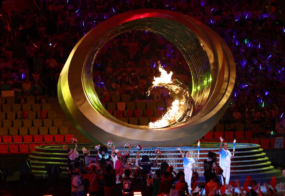 在12名火炬手的接力傳遞下,最終由王書茂和符攀嬋共同點燃主火炬,水與火在這座熱情的海島城市交相輝映。