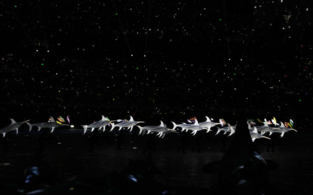 在全場觀眾“哇”的一聲驚嘆中,整座體育場化身星辰大海。騎自行車、滑輪滑、腳踩平衡車的演員們手舉海龜、鯊魚、海豚等形象魚貫而入,讓觀眾如置海底。隨后,高鐵飛馳、深海探測、火箭發(fā)射、太空行走等畫面在星海中逐一呈現(xiàn),展現(xiàn)了我國在高科技領(lǐng)域的發(fā)展成就,帶來生動的沉浸式體驗。