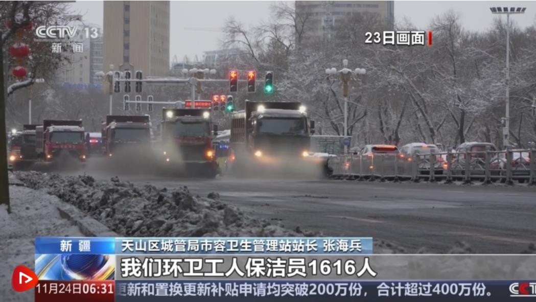 11月22日晚至11月23日,新疆北疆多地出現(xiàn)降雪,其中,烏魯木齊主城區(qū)出現(xiàn)暴雪。多地城管、交通等部門連夜作業(yè)清理積雪、疏導(dǎo)交通,保障道路通暢。