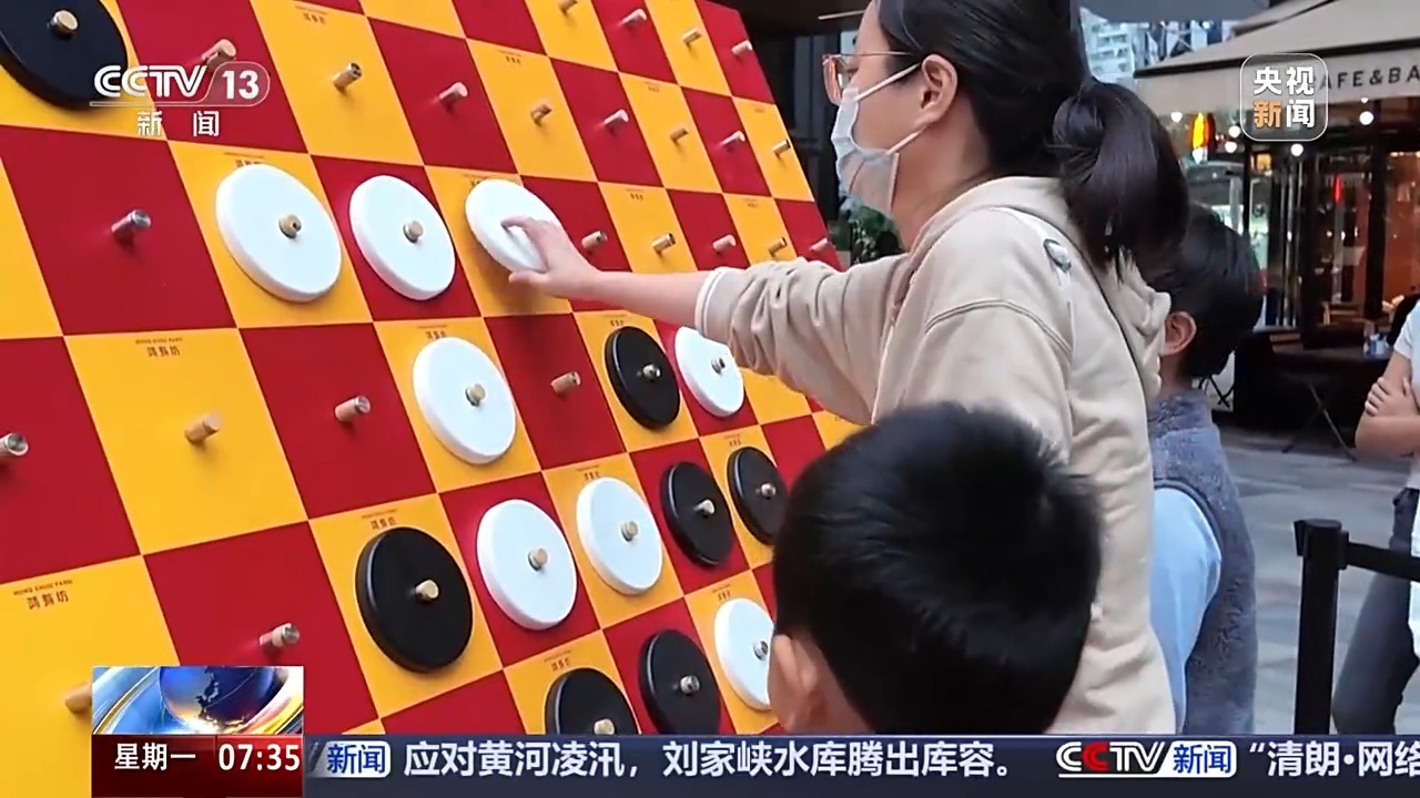 而上海的另一處熱門打卡地——“鴻壽坊”,則用煙火氣吸引著市民。在中心廣場(chǎng)上,一場(chǎng)“街坊擂臺(tái)”正在舉行。飛行棋、呼啦圈,簡(jiǎn)單有趣的運(yùn)動(dòng)吸引了許多參與者。
