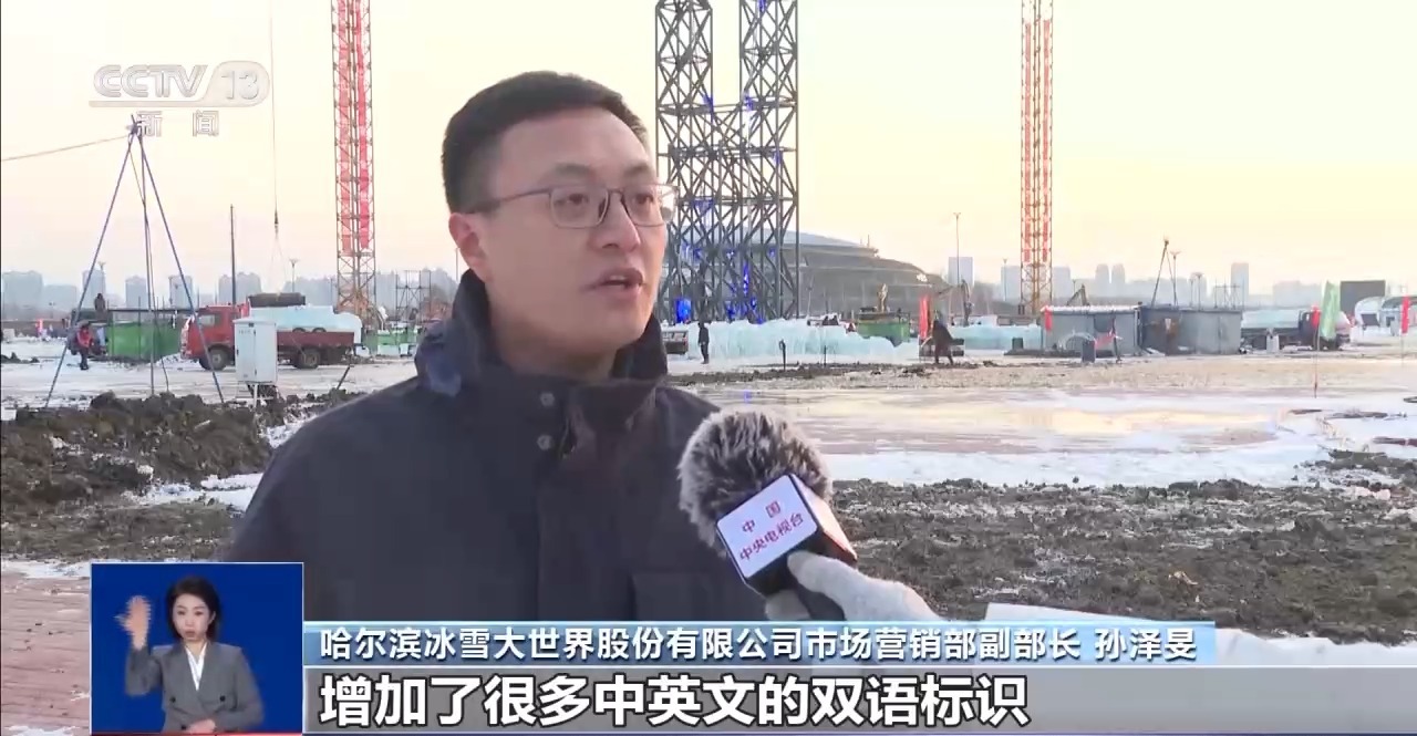 哈爾濱冰雪大世界股份有限公司市場營銷部副部長 孫澤旻:增加了很多中英文的雙語標(biāo)識,同時增加了英文的導(dǎo)游導(dǎo)覽服務(wù)。為了方便外國游客可以在園區(qū)內(nèi)購票,增加了可以識別護(hù)照、識別國際支付的支付系統(tǒng)和購票系統(tǒng)。