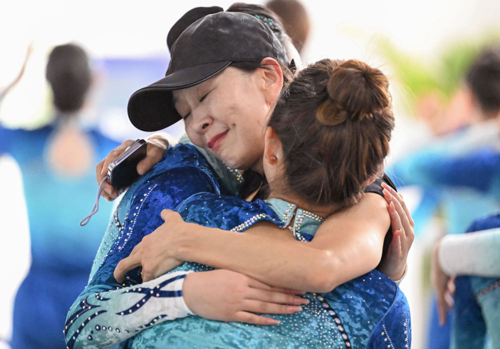 11月28日,上海隊教練韓春英(中)在成績公布后擁抱隊員激動落淚。最終,上海隊獲得二等獎。