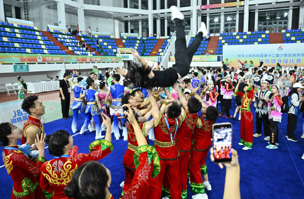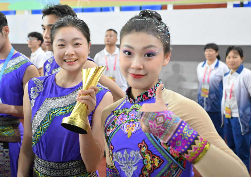 11月28日,西藏隊運動員慶祝團隊獲得民族健身操自選套路(輕器械)一等獎。