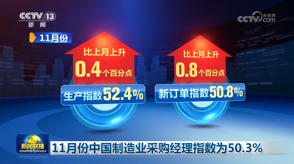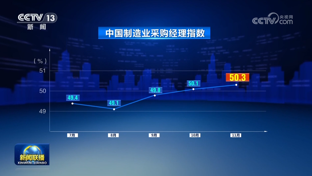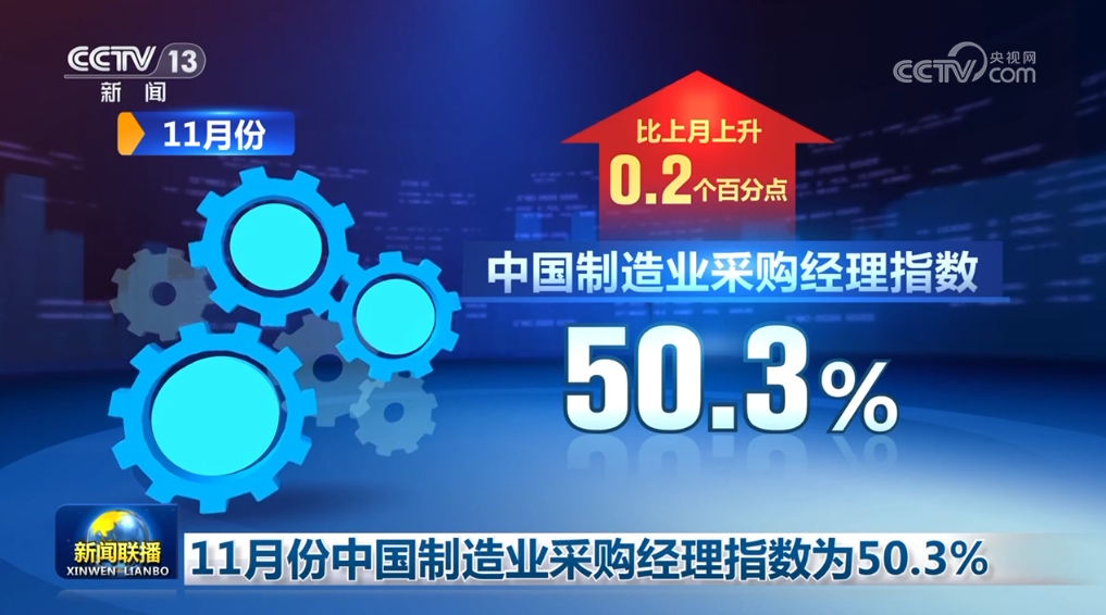 11月份中國制造業(yè)采購經(jīng)理指數(shù)為50.3%,比上月上升0.2個百分點。