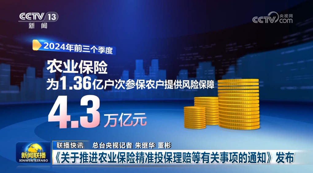 金融監(jiān)管總局等四部門近日聯(lián)合發(fā)布通知,對農(nóng)業(yè)保險投保理賠、應收保費、條款費率、數(shù)據(jù)共享等提出要求,進一步提高投保理賠精準性,推動我國農(nóng)業(yè)保險高質量發(fā)展。今年前三個季度,農(nóng)業(yè)保險為1.36億戶次參保農(nóng)戶提供風險保障4.3萬億元。