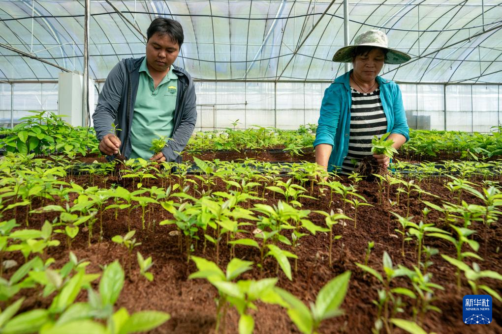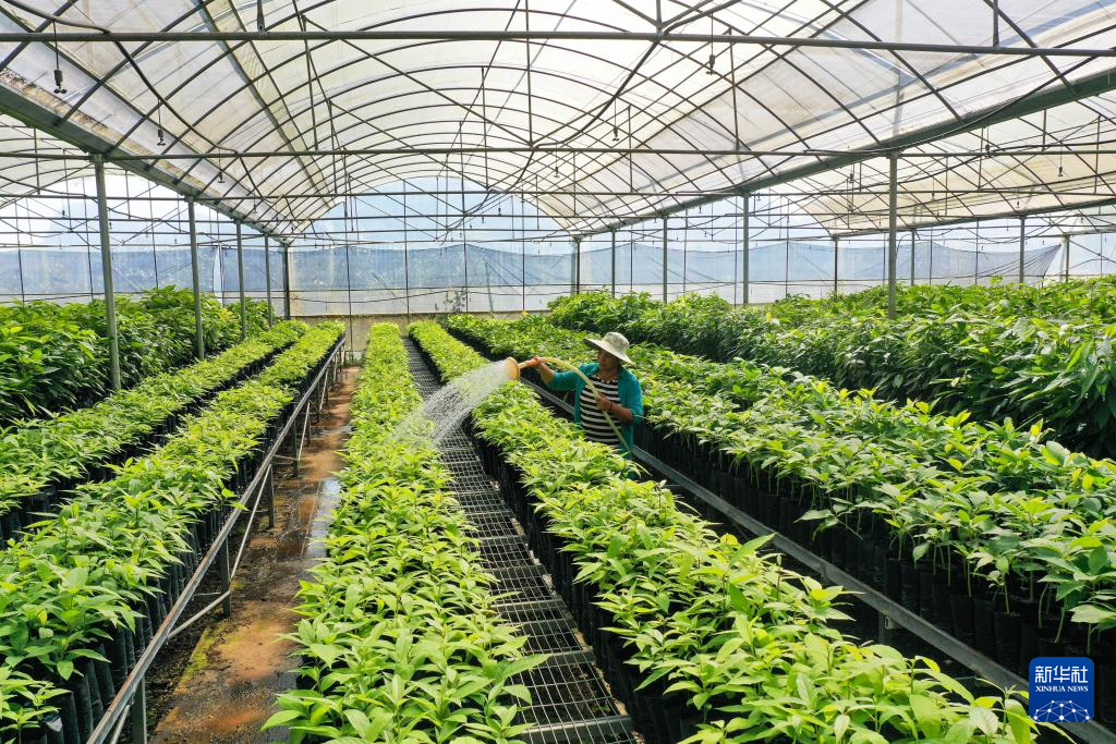 兩名工作人員在普洱綠銀生物股份有限公司的牛油果種苗基地打理種苗(10月28日攝)。新華社記者 陳欣波 攝