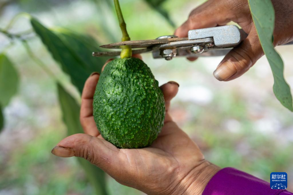由企業(yè)在當(dāng)?shù)剞r(nóng)民中培訓(xùn)的產(chǎn)業(yè)技術(shù)人員李美瓊在一處牛油果種植基地檢查待采的牛油果(10月29日攝)。新華社記者 陳欣波 攝