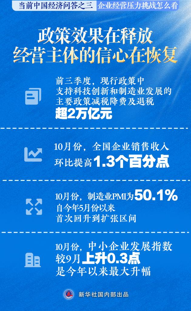 10月份,全國企業(yè)銷售收入同比增長,環(huán)比提高1.3個百分點(diǎn);制造業(yè)PMI為50.1%,自今年5月份以來首次回升到擴(kuò)張區(qū)間;非制造業(yè)商務(wù)活動指數(shù)連續(xù)數(shù)月穩(wěn)定在50%左右;中小企業(yè)發(fā)展指數(shù)較9月上升0.3點(diǎn),是今年以來最大升幅。