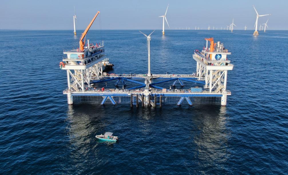 這是中廣核“伏羲一號”風(fēng)漁融合網(wǎng)箱平臺(無人機照片)。新華社記者鄧華 攝