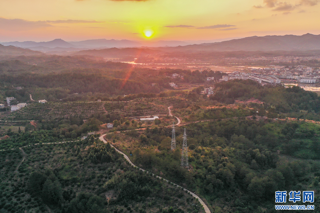 這是在長汀縣三洲鎮(zhèn)豐盈美麗生態(tài)農(nóng)場拍攝到的落日景觀。如今,這里月月有花開,季季有果采,昔日“火焰山”變成了“花果山”(無人機(jī)照片)。新華網(wǎng) 肖和勇 攝