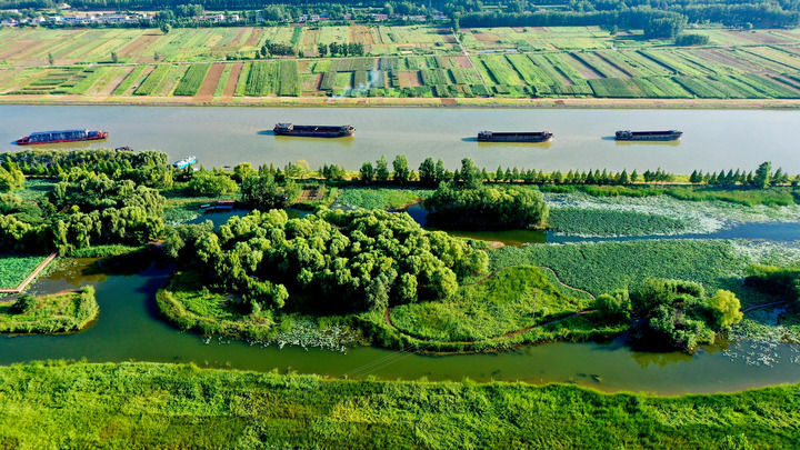 這是在山東省棗莊市臺(tái)兒莊區(qū)拍攝的大運(yùn)河國家文化公園(棗莊段)兩岸景色(2023年8月9日攝,無人機(jī)照片)。