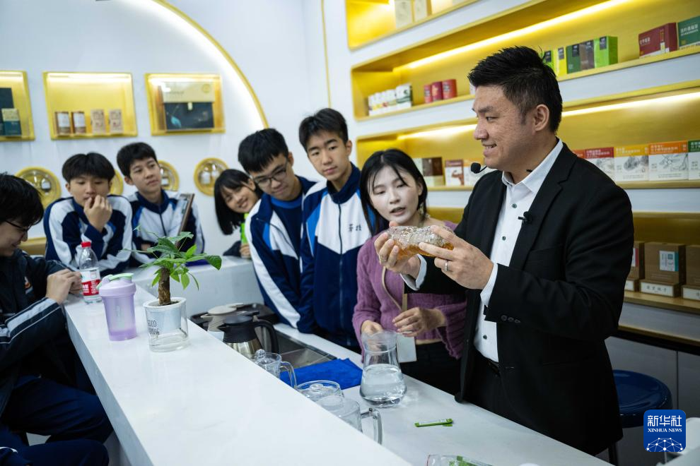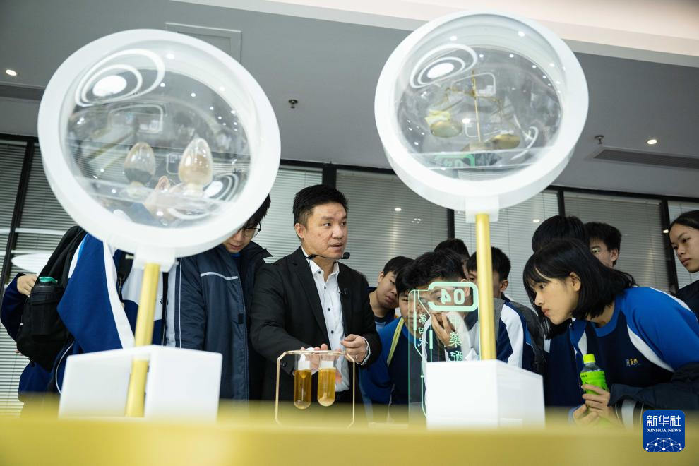 12月11日,黃滋才(右一)在位于橫琴的分子態(tài)(珠海橫琴)中醫(yī)藥健康產業(yè)發(fā)展有限公司的植物(現(xiàn)代中藥)分子博物館內與澳門勞校中學的學生交流。