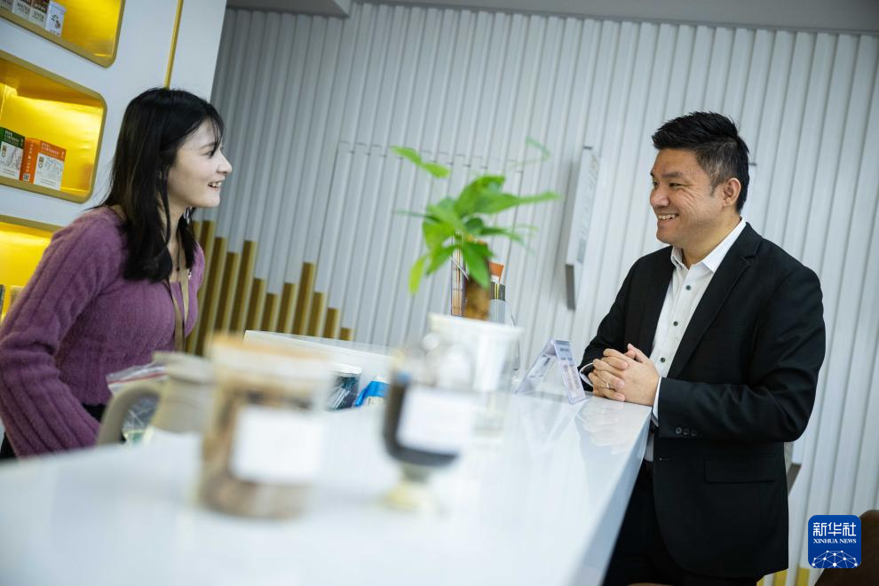 12月11日,黃滋才(右)在位于橫琴的分子態(tài)(珠海橫琴)中醫(yī)藥健康產業(yè)發(fā)展有限公司與同事聊天。