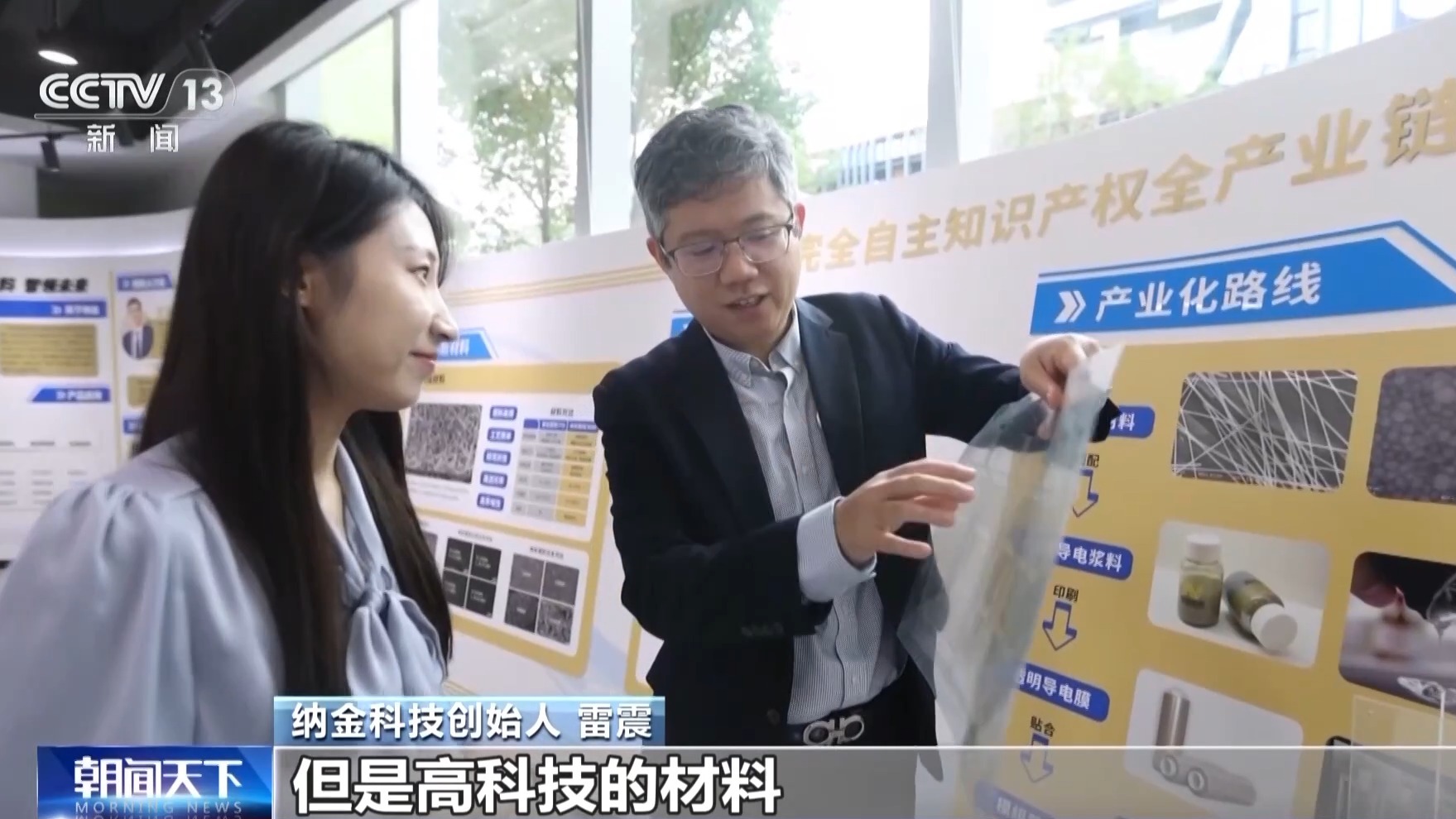 納金科技創(chuàng)始人 雷震:平平無奇的一張膜,但是高科技的材料已經(jīng)富含在里面了,這些位置印刷了一層納米銀線的材料,直徑大約相當于人頭發(fā)絲的萬分之一,柔性、耐彎折、靈敏度高、電阻更低、功耗更小,成本還能比傳統(tǒng)的薄膜降低30%左右,所有的材料和印刷工藝都是我們自己的技術,完全自主可控。