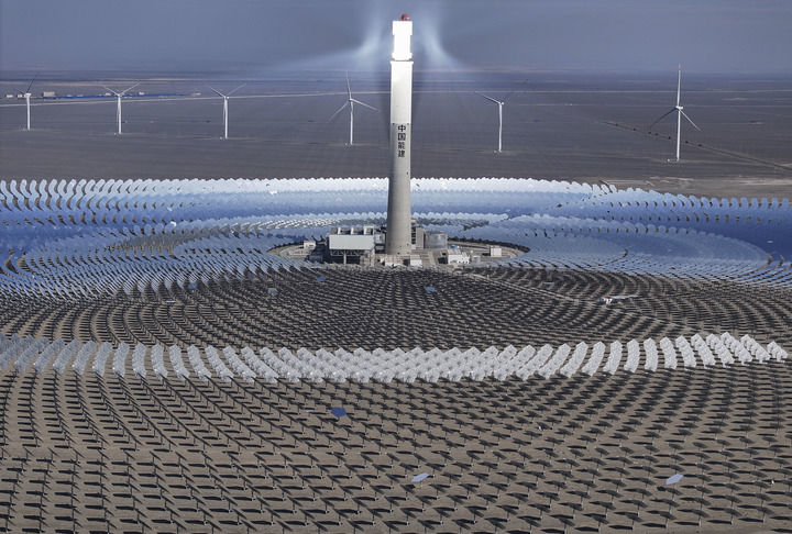 這是2024年9月12日在新疆哈密市伊吾縣淖毛湖鎮(zhèn)拍攝的國家光熱示范項(xiàng)目——熔鹽塔式50兆瓦光熱發(fā)電站(無人機(jī)照片)?! ⌒氯A社記者 胡虎虎 攝