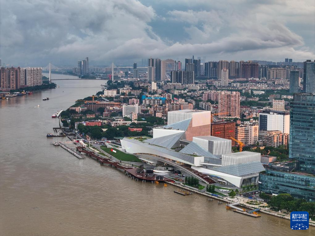 白鵝潭大灣區(qū)藝術(shù)中心宛如“文化巨輪”揚(yáng)帆珠江(2024年4月27日攝,無(wú)人機(jī)照片)。