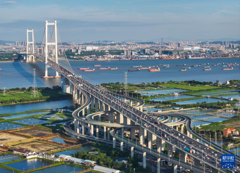 南沙大橋上的車流和獅子洋水道的船舶來(lái)來(lái)往往(2024年10月2日攝,無(wú)人機(jī)照片)。