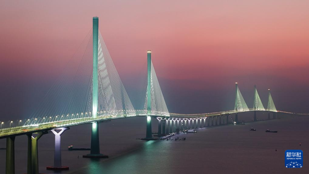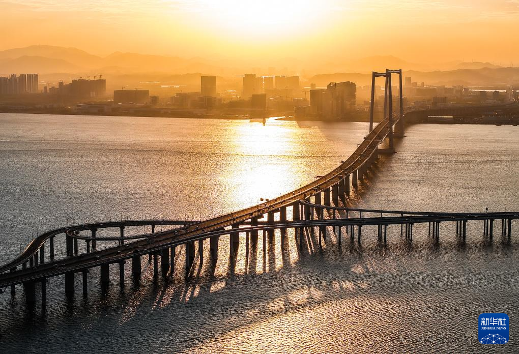 暮色中的黃茅??绾Mǖ栏邫诟鄞髽颍ㄗ髠?cè)雙主塔)和黃茅海大橋(右側(cè)三主塔)(2024年12月7日攝,無(wú)人機(jī)照片)。