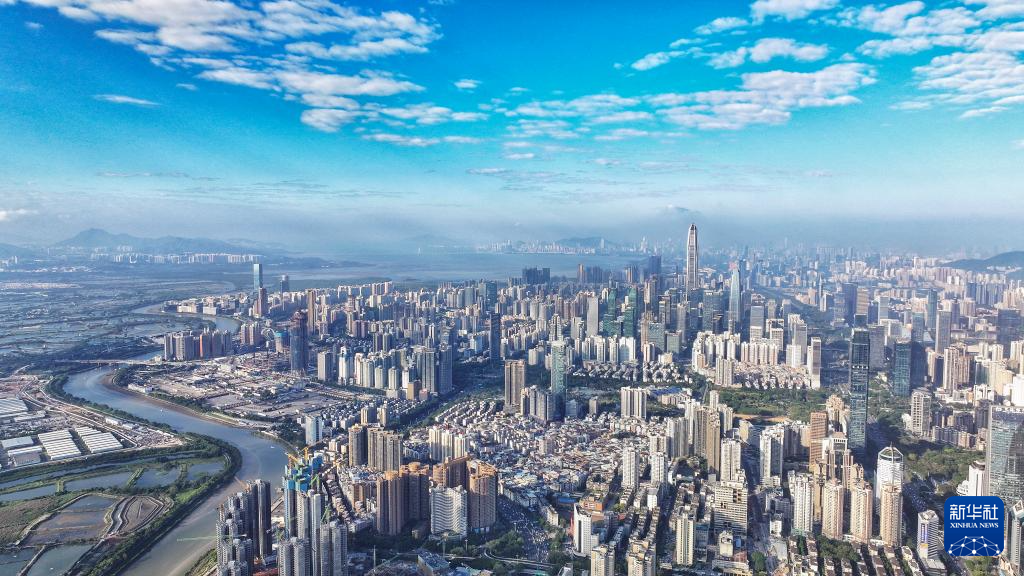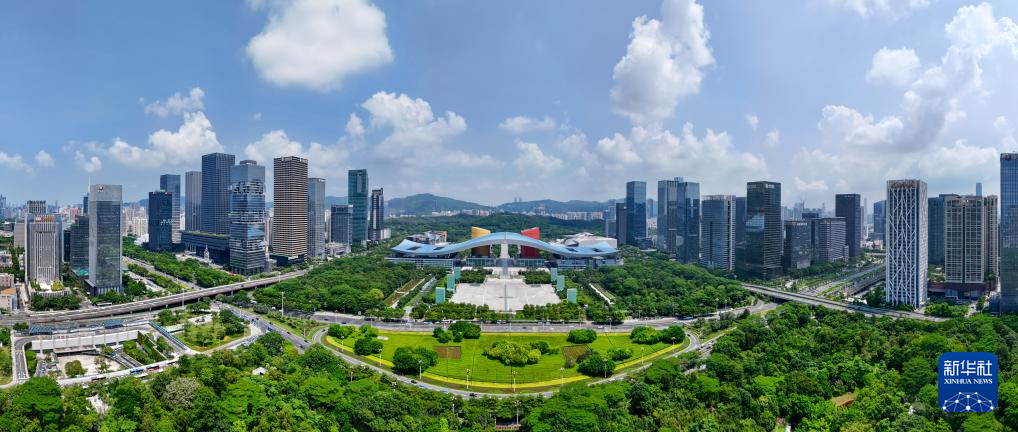 這是貫穿深圳福田CBD、市民中心、蓮花山公園的深圳中軸線(2024年8月27日攝,無(wú)人機(jī)全景照片)。