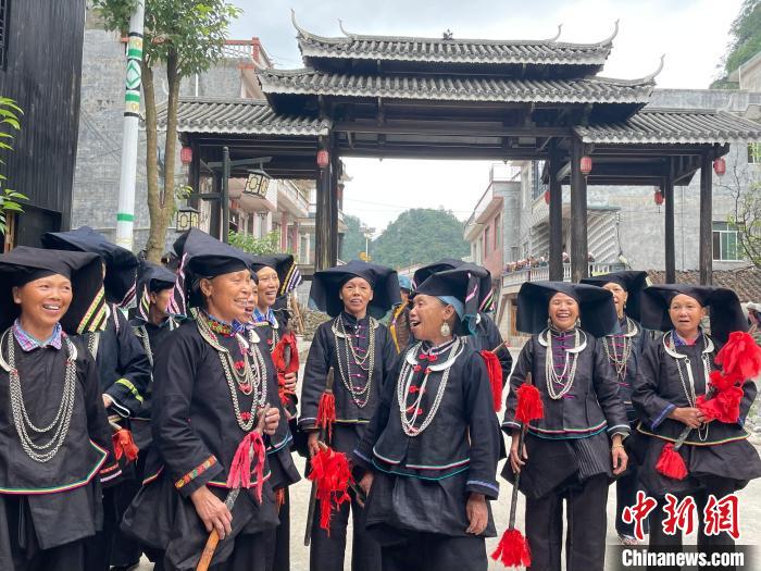 冬日午后,廣西百色市那坡縣坡荷鄉(xiāng)中山村內(nèi),婦女身著黑色古樸服飾,唱起高亢嘹亮的山歌。