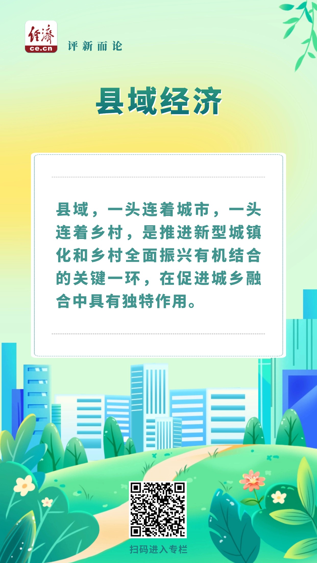 縣域,一頭連著城市,一頭連著鄉(xiāng)村,是推進(jìn)新型城鎮(zhèn)化和鄉(xiāng)村全面振興有機(jī)結(jié)合的關(guān)鍵一環(huán),在促進(jìn)城鄉(xiāng)融合中具有獨(dú)特作用。因此,發(fā)展壯大縣域經(jīng)濟(jì),還要把縣域發(fā)展納入城鄉(xiāng)融合、區(qū)域協(xié)調(diào)發(fā)展的大格局中。在完善自身基礎(chǔ)設(shè)施建設(shè)、提高公共服務(wù)水平的過(guò)程中,縣域要充分發(fā)揮連接城鄉(xiāng)發(fā)展的“橋梁”作用,不僅讓各類(lèi)優(yōu)勢(shì)資源、公共服務(wù)從城市逐步向鄉(xiāng)村延伸,也讓越來(lái)越多的美麗鄉(xiāng)村被發(fā)掘和點(diǎn)亮。