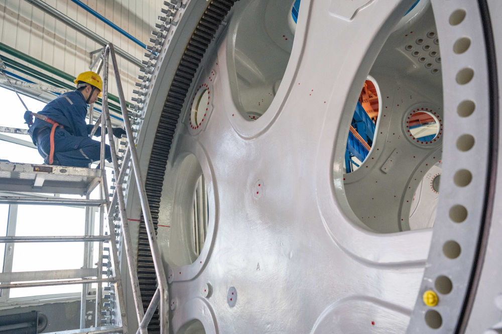 工人在位于黑龍江省齊齊哈爾市的中國一重集團(tuán)有限公司風(fēng)電設(shè)備裝配車間加工風(fēng)電輪轂(4月28日攝)。新華社記者 謝劍飛 攝