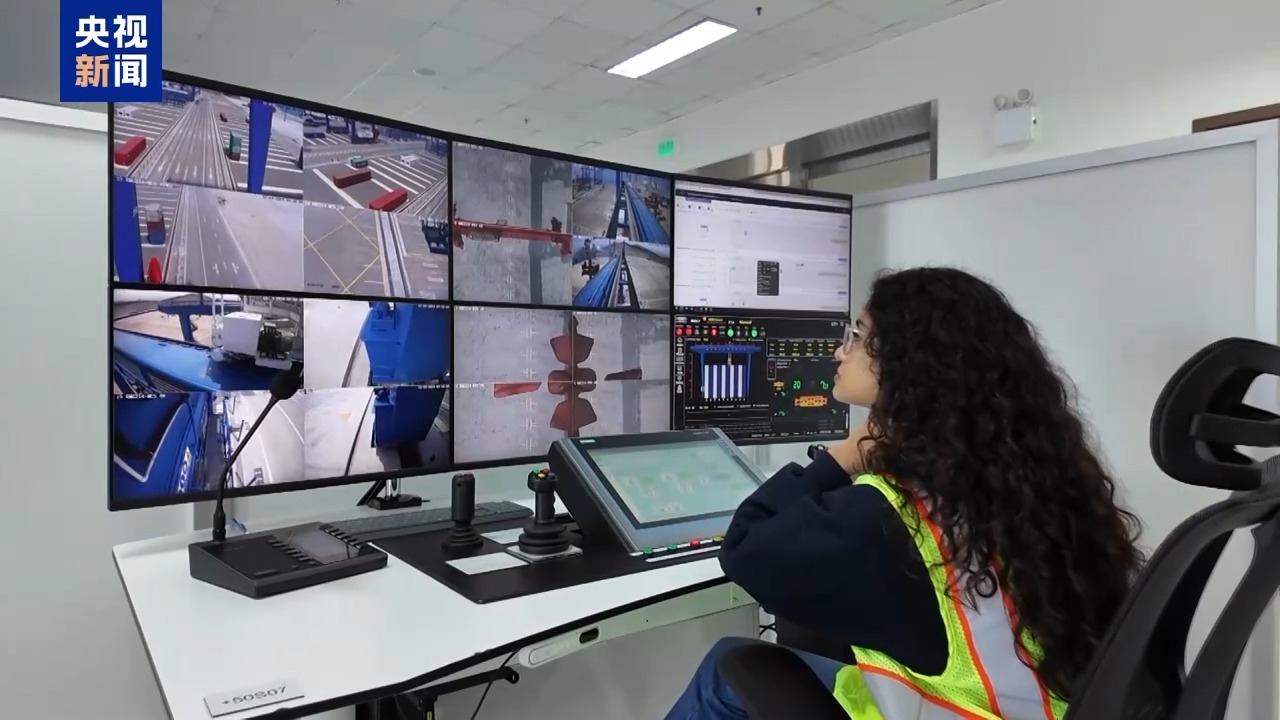 在遠(yuǎn)程操作區(qū),我們看到,通過電腦控制系統(tǒng)即可實現(xiàn)港口裝卸的全自動化操作。員工無需再攀上高高的吊機(jī),只需坐在控制臺前,通過多角度實時監(jiān)控屏和搖桿手柄,便能精確完成數(shù)百噸甚至上千噸集裝箱的裝卸任務(wù)。