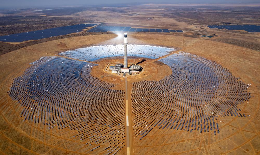 這是2024年8月20日在南非北開普省拍攝的南非紅石100兆瓦塔式熔鹽光熱電站項目(無人機照片)。新華社記者 張譽東 攝