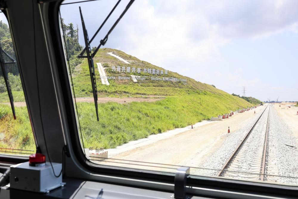 2024年5月6日,在馬來西亞彭亨州馬東鐵項目沿途的山坡上,兩行中文和馬來文大字“共商共建共享,共創(chuàng)美好未來”映入眼簾。新華社記者 程一恒 攝
