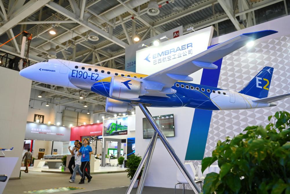 這是在廈門舉行的2024金磚國家新工業(yè)革命展巴西展位展出的E190-E2飛機模型(2024年9月10日攝)。新華社記者 林善傳 攝