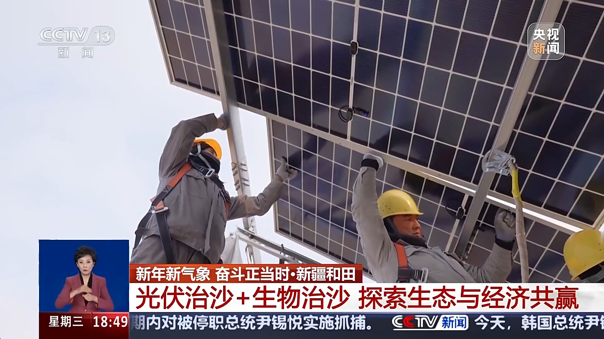 除了為生物治沙作準備,塔克拉瑪干沙漠中還有不少光伏項目正在建設,工人們加緊鋪設光伏板,到春天,光伏板下還會種上苜蓿、狼尾草等固沙植物,這處包含光伏治沙、生物治沙的鎖邊工程拓寬項目,也將成為新疆探索生態(tài)治理與經(jīng)濟發(fā)展共贏的一個新模式。