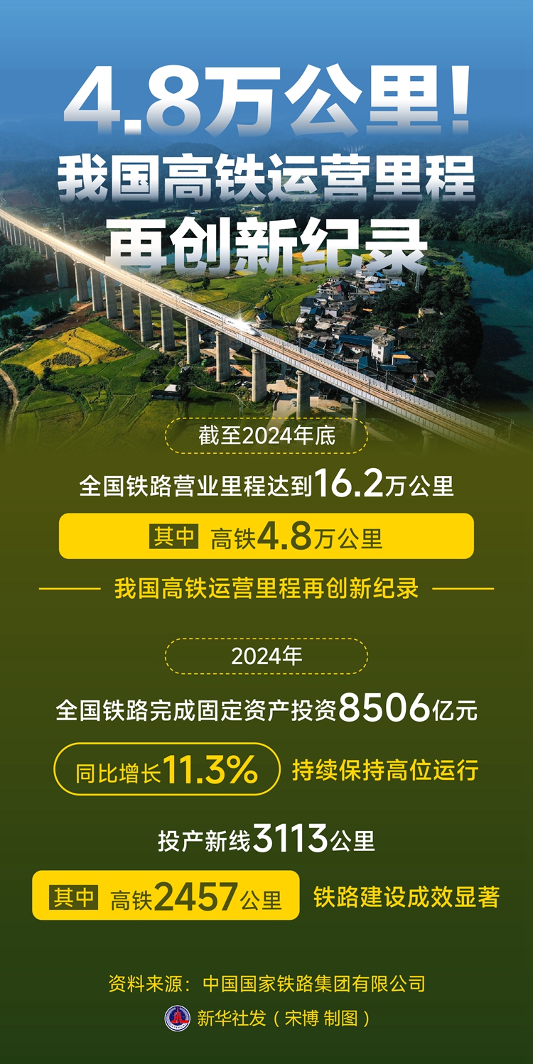 2日,中國國家鐵路集團(tuán)有限公司召開工作會議。會議發(fā)布的最新統(tǒng)計(jì)數(shù)據(jù)顯示,截至2024年底,全國鐵路營業(yè)里程達(dá)到16.2萬公里,其中高鐵4.8萬公里,我國高鐵運(yùn)營里程再創(chuàng)新紀(jì)錄。