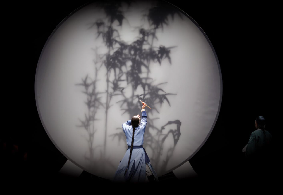舞臺上,古琴與琵琶的悠揚旋律仿若一陣清風,輕輕拂開歷史的畫卷,清代揚州的風情萬種如詩如畫般徐徐展開。鄭板橋筆下的竹、蘭、石化作他性格的三種特質,生動地展現(xiàn)了為官之德、書生之質、為民之心,以及他對生命價值的執(zhí)著堅守,深深地震撼著每一位觀者的心靈,讓他們沉浸其中,心潮澎湃。