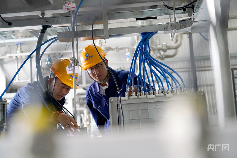 內蒙古鄂爾多斯,工人利用光伏發(fā)出的綠電制取綠氫