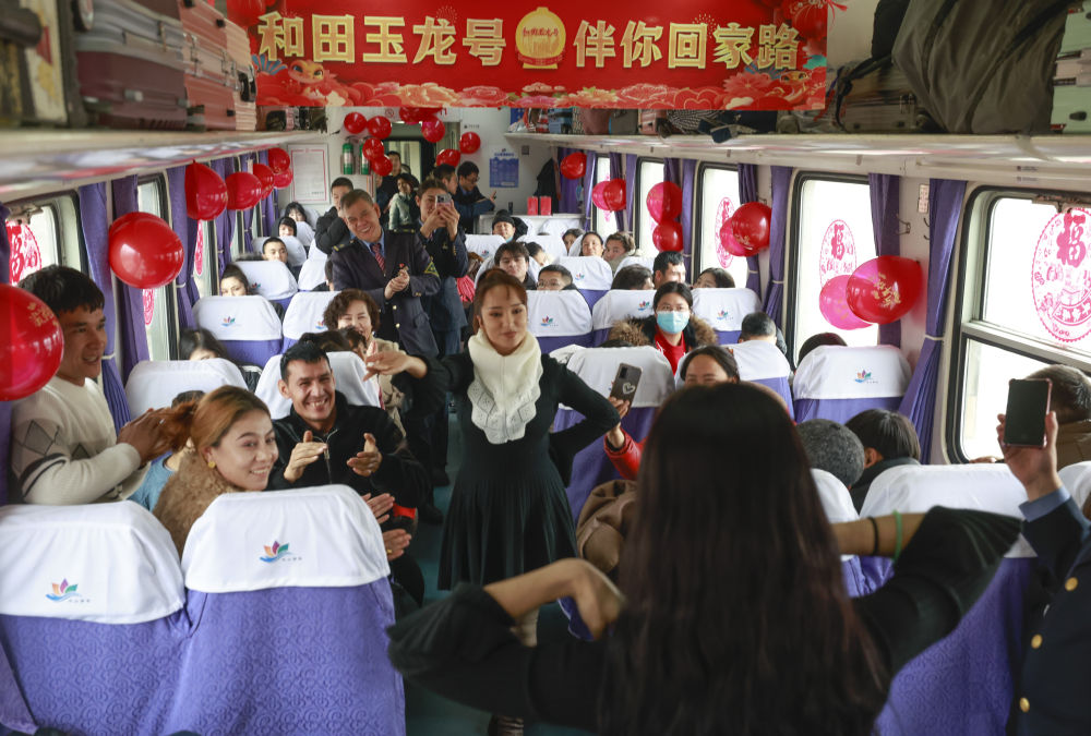 在7557次列車上,旅客隨音樂跳起麥西來甫。新華社記者 王菲 攝
