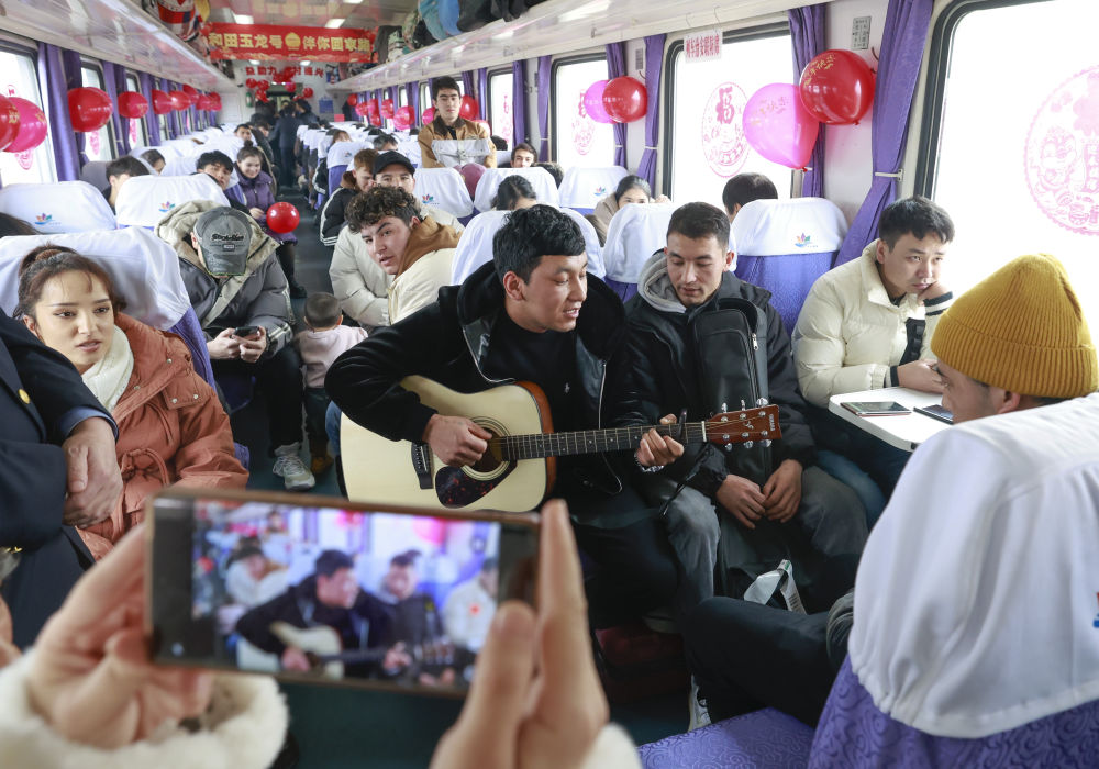 悠揚(yáng)的琴聲引起其他旅客的注意。得知還有人擅長彈琴,米爾阿迪力熱情地遞上自己的吉他,好幾個(gè)手癢的旅客輪番獻(xiàn)藝,聽到柔情的民謠,不少人跟著哼唱起來。午后的陽光透進(jìn)車窗,窗戶上的“福”字映在旅客們的臉上。