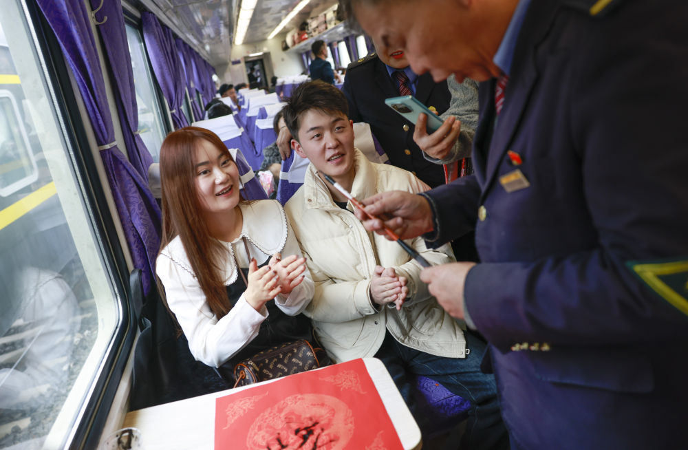 為了讓人們“滿載而歸”,列車員熱情組織旅客寫“福”字,還送上飽含心意的春聯(lián)、列車紀(jì)念徽章等禮物。