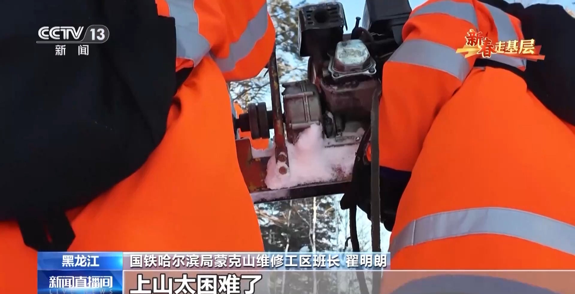 國鐵哈爾濱局蒙克山維修工區(qū)班長 翟明朗:要下山還行,上山太困難了,山里有溝的地方我們看不到,雪都是平的,而有的時候一踩禿嚕就掉雪溝里了。