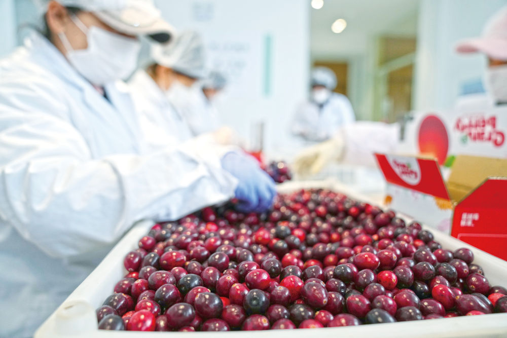 在黑龍江省撫遠(yuǎn)市蔓越莓種植基地研發(fā)中心,工作人員正在挑選蔓越莓鮮果。新華社記者王建威