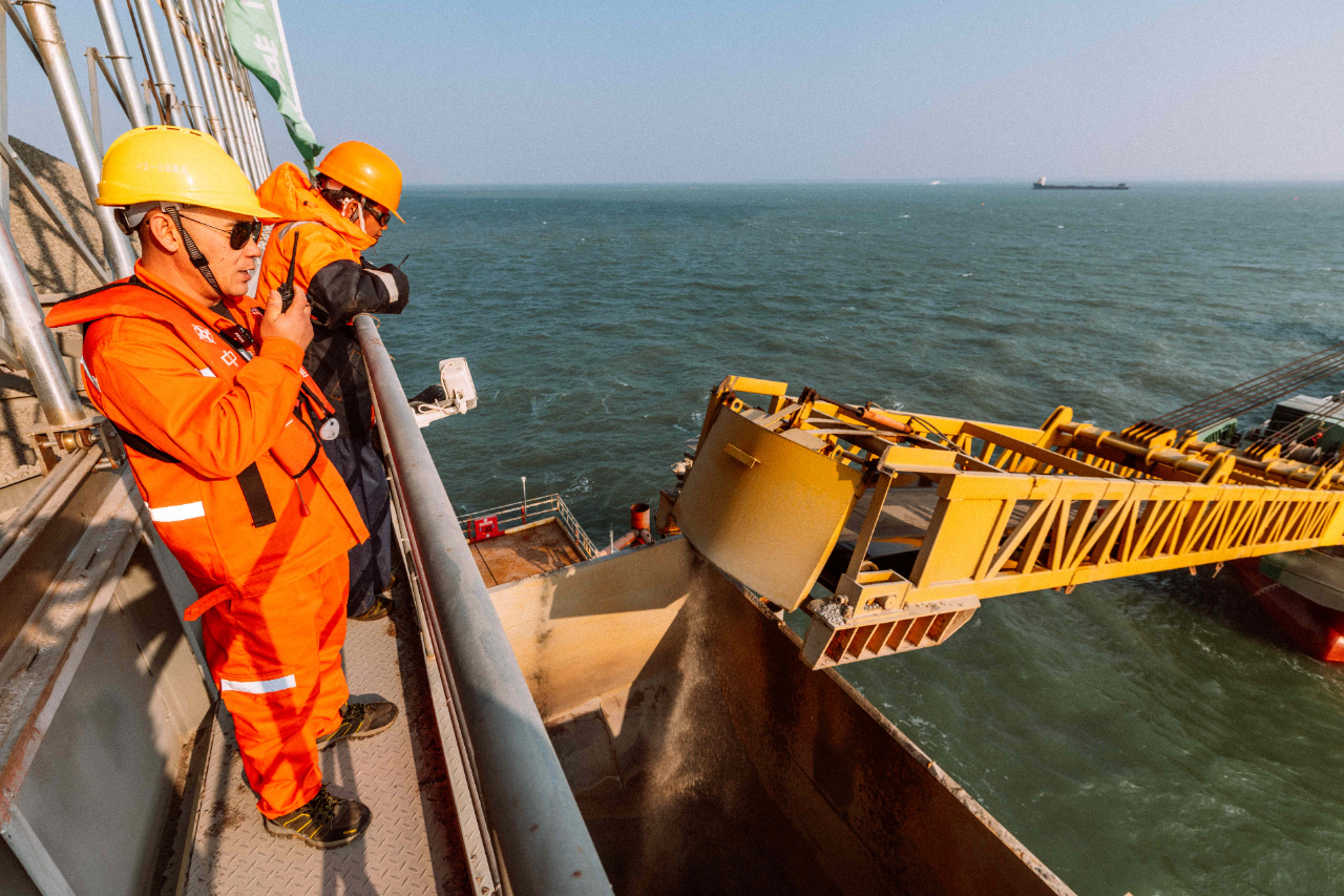 1月17日,夕陽下的廈門劉五店港區(qū),北風(fēng)勁吹。在距離中交一公局集團(tuán)廈金大橋(廈門段)項(xiàng)目海上平臺(tái)混凝土操作員梁芝敬站立位置不到30米的洋面上,一艘船身印有“帆順168”字樣的補(bǔ)料船,裝載著4000多噸砂石緩緩抵近。船頭前方延伸出一條25米長的傳送皮帶,將船上的砂料源源不斷地送抵老梁眼前的鋼制固料斗內(nèi)。當(dāng)天他們要趁著海水退潮帶來的作業(yè)窗口,為站里補(bǔ)上700噸機(jī)制砂和900噸粒徑10到20毫米的小石子,以確?;炷琳旧a(chǎn)不停機(jī)。